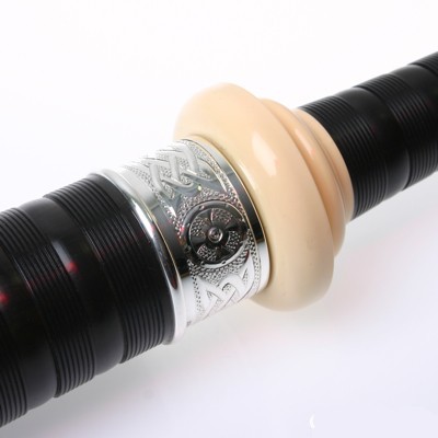 Imitation ivory projecting mounts, hand-engraved silver ferrules, slides and ringcaps. plus, hand-engraved silver mouthpiece with McCallum wooden pipe chanter.