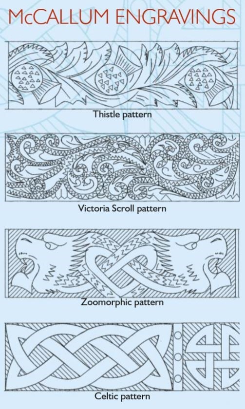Available in four different patterns: Thistle, Zoomorphic, Victorian scroll and Celtic — all four patterns are works of art and the detail is of the highest quality. The time and accuracy required on each mount makes the pipes slightly more expensive.