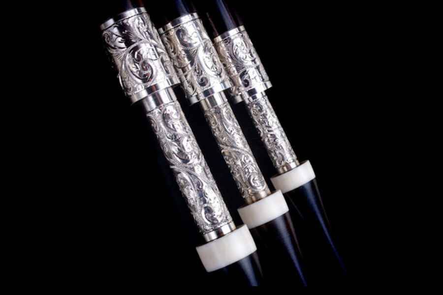 The silver model comes mounted in hand engraved Sterling silver. The set includes silver ferrules, ring caps, and tuning slides. The quality shines in the silver mounts, adding distinction and beauty. This model is available in Acanthus or Victorian silver designs.