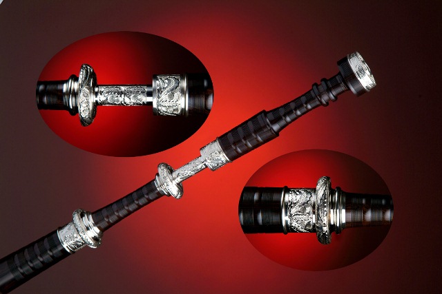 The DN6 is our premiere set. It is both majestic and powerful, showcasing the best craftsmanship and metalwork we offer. These are top of the line David Naill pipes, fully mounted with hand engraved Sterling silver. We exclusively use .925 Sterling silver for this model. Included are full silver mouthpiece and chanter sole – both made from a solid piece. The projecting mounts are made from thick-walled castings which are machined and then turned by hand to finish – they are not filled. The weight of the Sterling silver on this set is approximately 1.35 kgs/2.98 lbs.