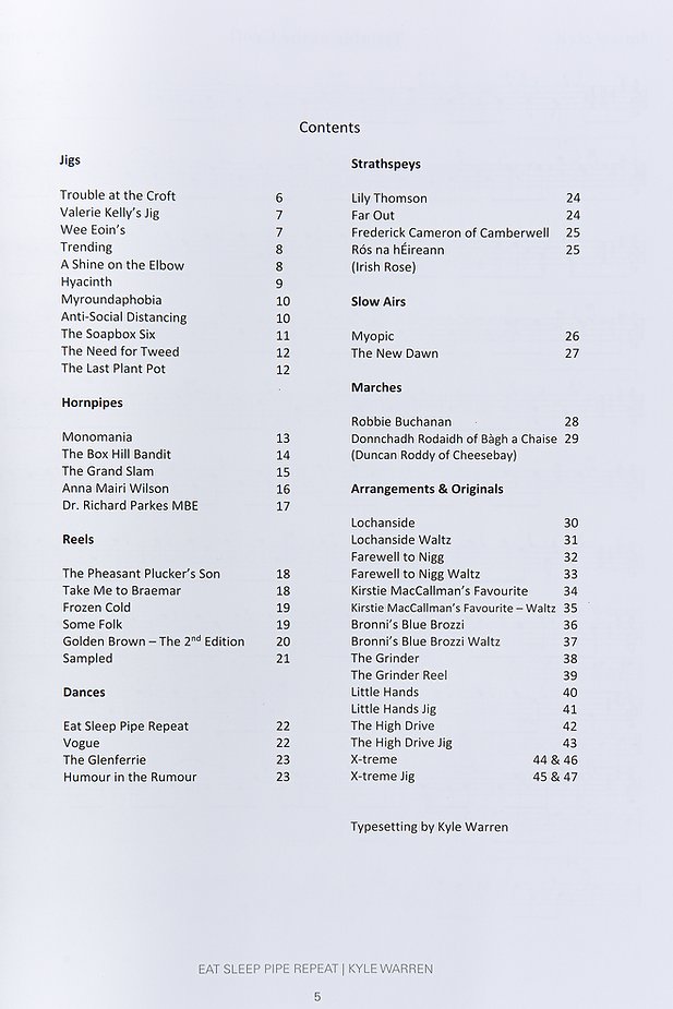 EAT SLEEP PIPE REPEAT is the new collection of bagpipe music by Kyle Warren. The book consists of 50 tunes, of which 42 are by Kyle. These include 34 new compositions, and 8 arrangements of modern and classic pipe tunes, with the original tunes also published in the book from famous composers such as Gordon Duncan, Chris Armstrong, Mark Saul and more!